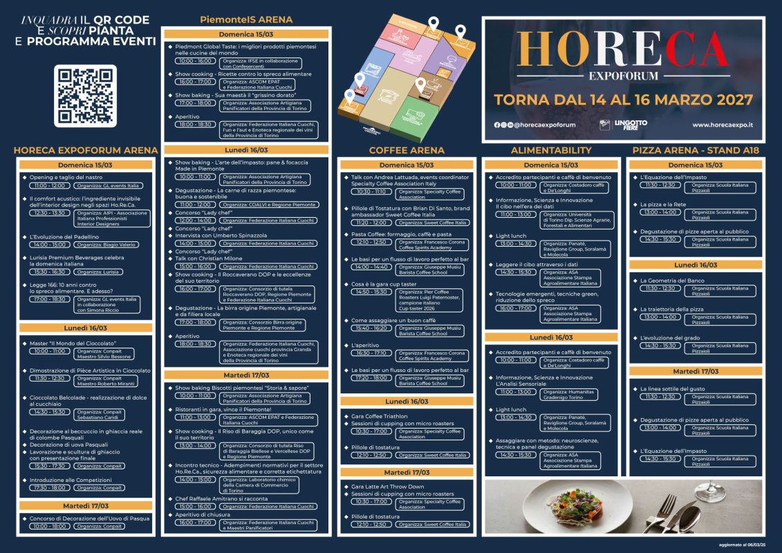 Su un'area espositiva di 13.000 mq, Horeca Expoforum darà voce ai protagonisti della filiera anche attraverso un ricco palinsesto di oltre 100 eventi tra showcooking, competizioni, incontri, dibattiti, degustazioni e corsi di formazione. Gli appuntamenti della 3 giorni comprende focus su caffè, pizza, pasticceria, degustazioni di tè, aperitivi dolci e salati, show-cooking e molto altro. A supporto, numerosi partner che riconoscono il valore e l’opportunità di Horeca Expoforum, come principale piazza del territorio.