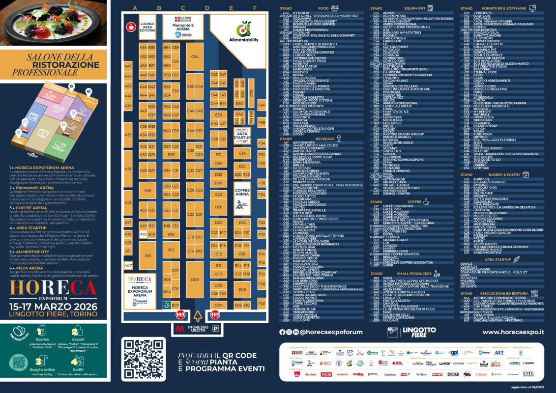 Scarica la mappa ufficiale di Horeca Expoforum: non perderti nessuna area e attività! Il focus della tre giorni torinese sarà concentrata sulla parte espositiva, alla presenza di oltre 200 brand leader del settore: dalle aziende alimentari ai fornitori di servizi, tecnologie e macchinari fino alle innovative start up che operano per rendere ancora più performante, appetibile e all’avanguardia un mondo dell’horeca in continuo mutamento e aggiornamento.
